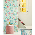 Lichtblauw vliesbehang met een linnenstructuur. Het behang heeft blauwe, roze, rode, gele en groene bloemen en blauwe vogeltjes. Het behang past goed op slaapkamer en meidenkamers maar kan ook leuk staan in showrooms en etalages. Het behang is goed te combineren met witte muren. Voor een extra spectaculair effect kan je dit behang ook goed met goud kunnen combineren.