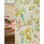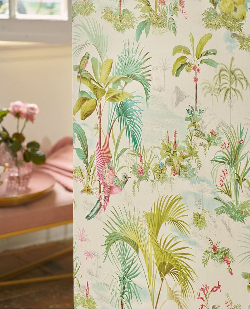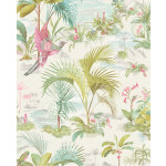 Wit vliesbehang met groene palmbomen en roze vogels en bloemen. Het behang past goed op slaapkamer en meidenkamers maar kan ook leuk staan in showrooms en etalages. Het behang is goed te combineren met witte muren. Voor een extra spectaculair effect kan je dit behang ook goed met goud kunnen combineren.