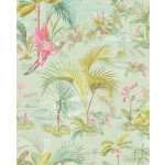 Lichtgroen vliesbehang met blauwe en groene palmbomen en roze vogels en bloemen. Het behang past goed op slaapkamer en meidenkamers maar kan ook leuk staan in showrooms en etalages. Het behang is goed te combineren met witte muren. Voor een extra spectaculair effect kan je dit behang ook goed met goud kunnen combineren.