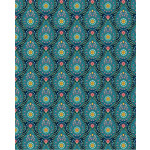Donkerblauw vliesbehang met een patroon van bloemen in druppelvorm.
