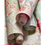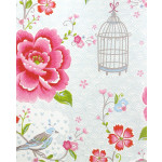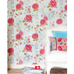 Wit vliesbehang met grote roze bloemen en beige vogelkooitjes. Op de achterbrond zijn lichtglanzende boogjes in het lichtblauw. Het behang past goed op slaapkamer en meidenkamers maar kan ook leuk staan in showrooms en etalages. Het behang is goed te combineren met witte muren. Voor een extra spectaculair effect kan je dit behang ook goed met goud kunnen combineren.