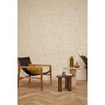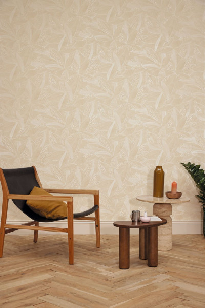 Het dessin Natura 106041050 uit de collectie Origine van Caselio is behang met een wit patroon van bladeren op een beige achtergrond.