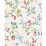 Wit vliesbehang met op de voorgrond bloemen in het blauw, roze, groen en geel en op de achtergrond staan bloempatronen in het lichtglanzend zilver. Het behang past goed op slaapkamer en meidenkamers maar kan ook leuk staan in showrooms en etalages. Het behang is goed te combineren met witte muren. Voor een extra spectaculair effect kan je dit behang ook goed met goud kunnen combineren.