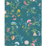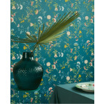 Donkerblauw vliesbehang met op de voorgrond bloemen in het blauw, roze, groen en geel en op de achtergrond staan bloempatronen in het lichtglanzend blauw. Het behang past goed op slaapkamer en meidenkamers maar kan ook leuk staan in showrooms en etalages. Het behang is goed te combineren met witte muren. Voor een extra spectaculair effect kan je dit behang ook goed met goud kunnen combineren.