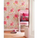 Beige vliesbehang met grote roze bloemen en beige vogelkooitjes. Op de achterbrond zijn lichtglanzende boogjes in het beige. Het behang past goed op slaapkamer en meidenkamers maar kan ook leuk staan in showrooms en etalages. Het behang is goed te combineren met witte muren. Voor een extra spectaculair effect kan je dit behang ook goed met goud kunnen combineren.