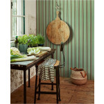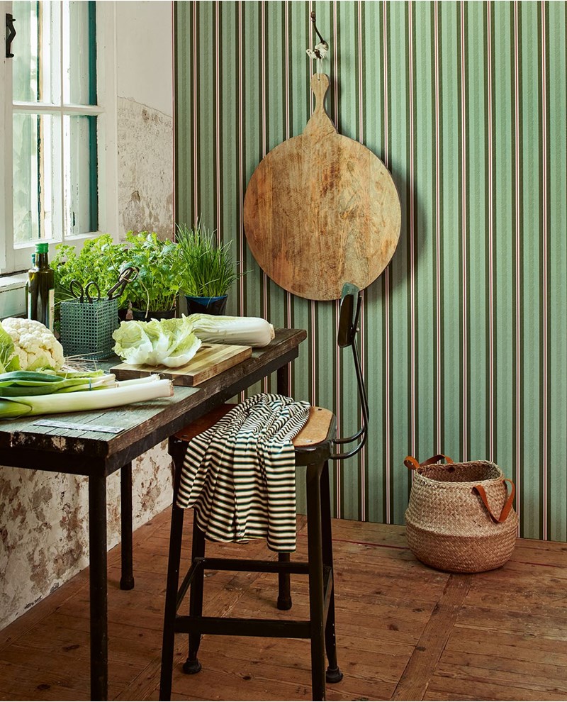 Vliesbehang met verticale strepen in het donkergroen, lichtgroen, rood, goud en wit. De lichtgroene en donkergroene strepen zijn ongeveer 1.5 cm breed en de witte, rode en gouden lijnen zijn ongeveer 0.5 cm. De brede lijnen hebben schuine streepjes met een lichte structuur. Het behang past goed op slaapkamer en meidenkamers maar kan ook leuk staan in showrooms en etalages. Het behang is goed te combineren met witte muren. Voor een extra spectaculair effect kan je dit behang ook goed met goud kunnen combineren.