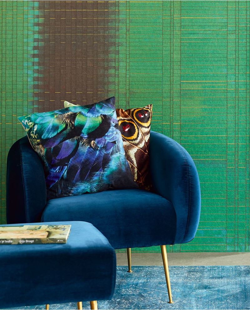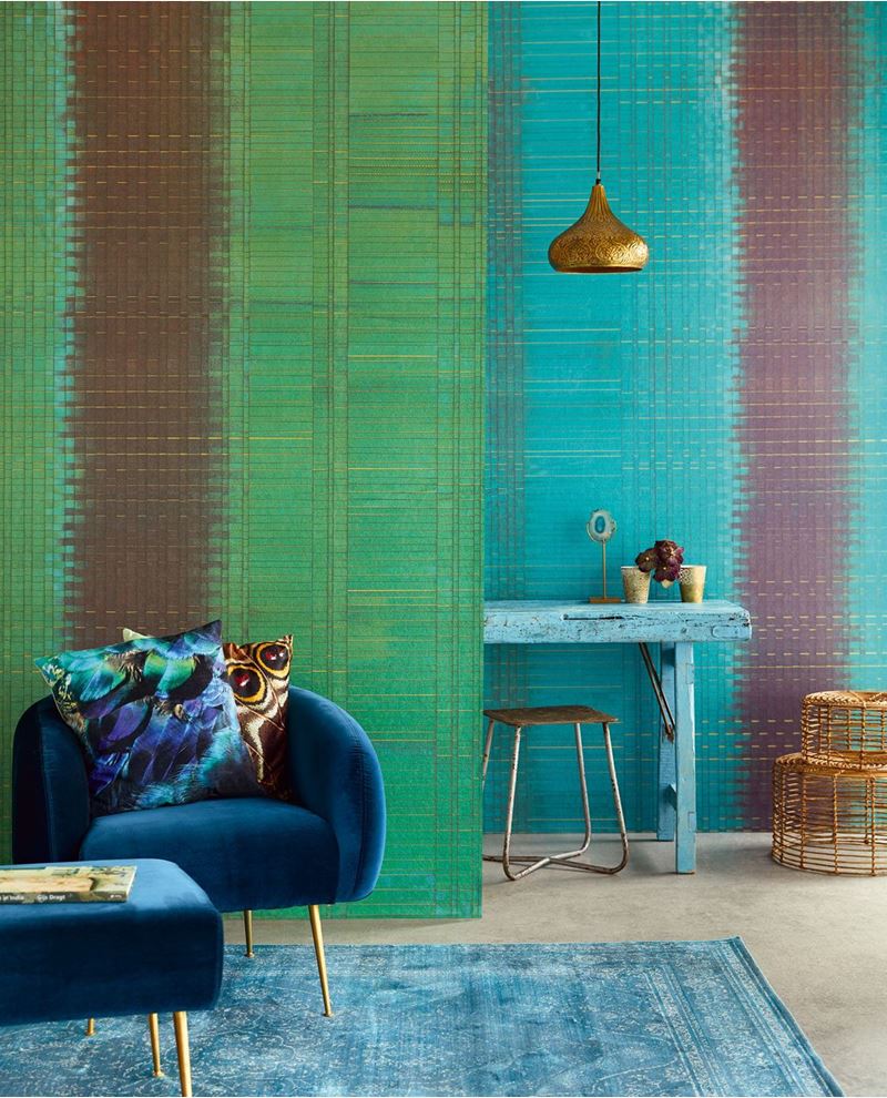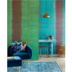 Wandposter waarbij het lijkt alsof het gemaakt is van gevlochten papier. Over het behang ligt een subtiele glanslaag en het bestaat voornamelijk uit groentinten, maar wordt afgewisselt door de kleuren bruin en goud.