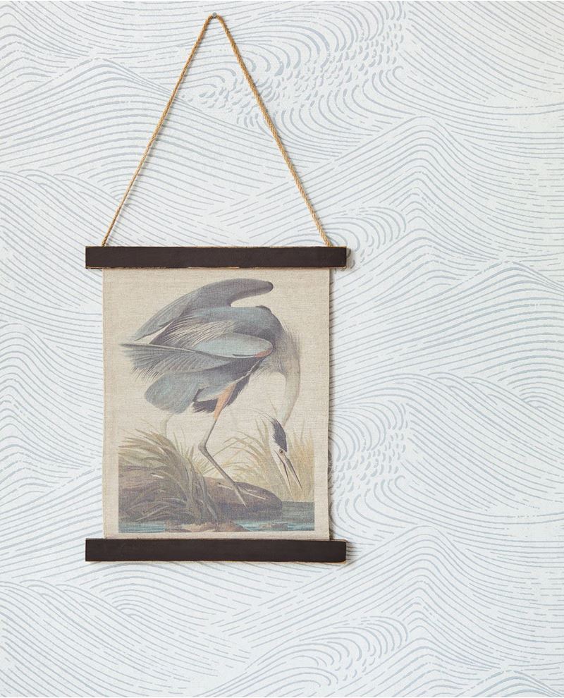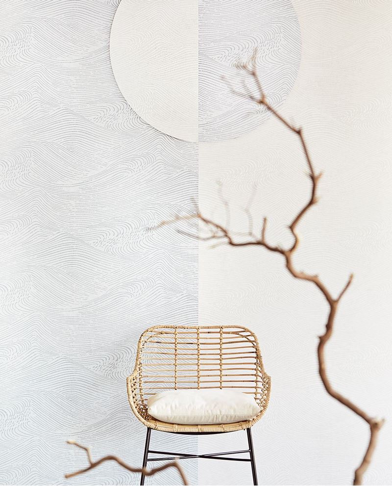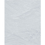Lichtblauw vliesbehang met blauwe lijnen die een zee vol golven vormen.