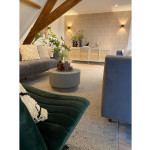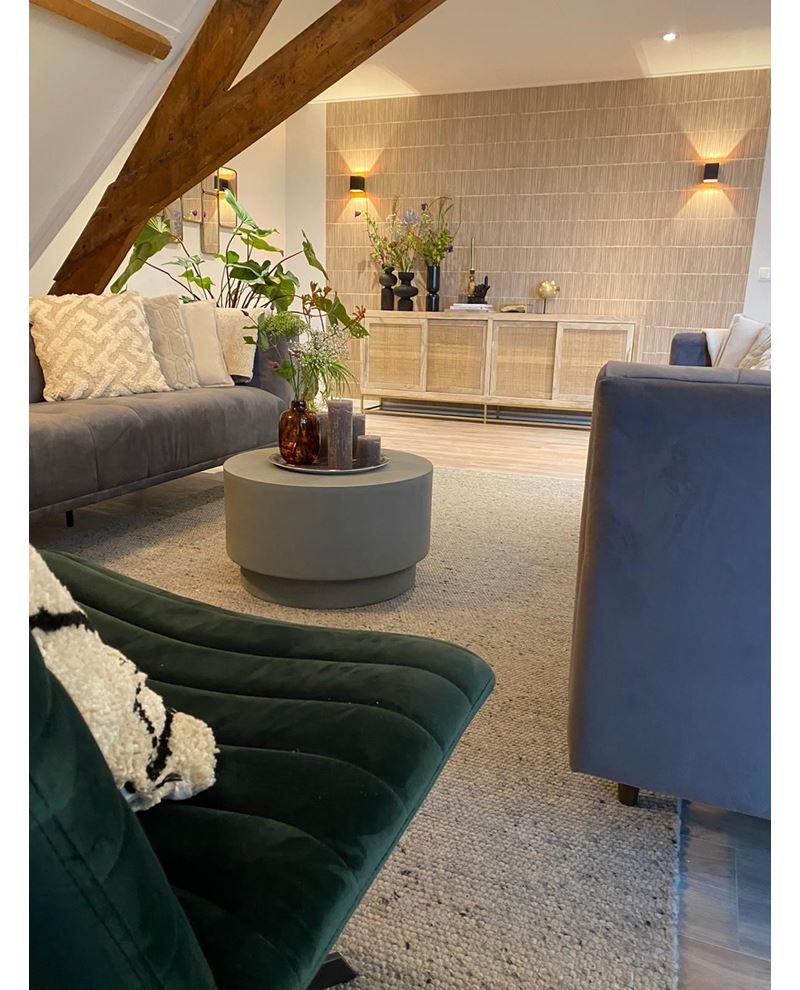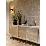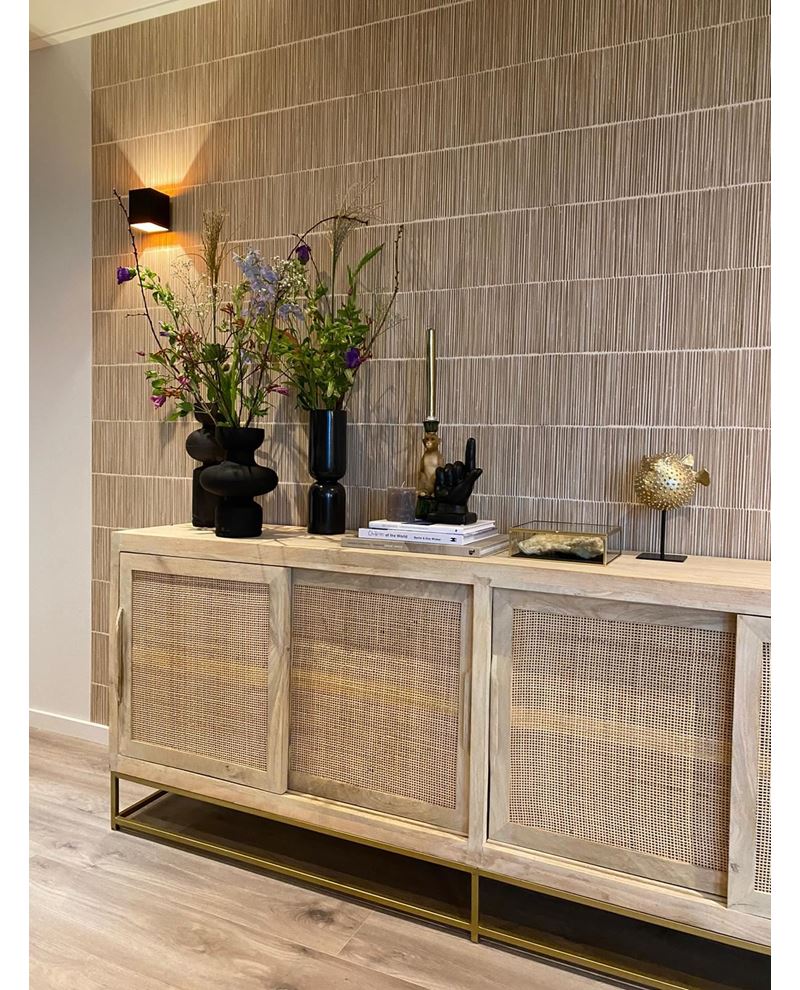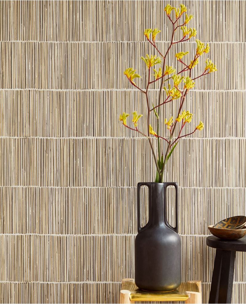 Gebroken wit vliesbehang met beige verticale lijnen.