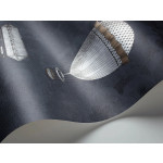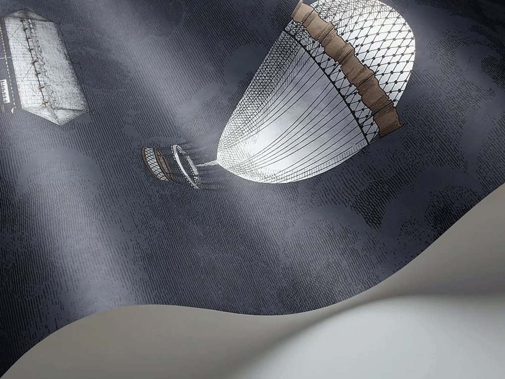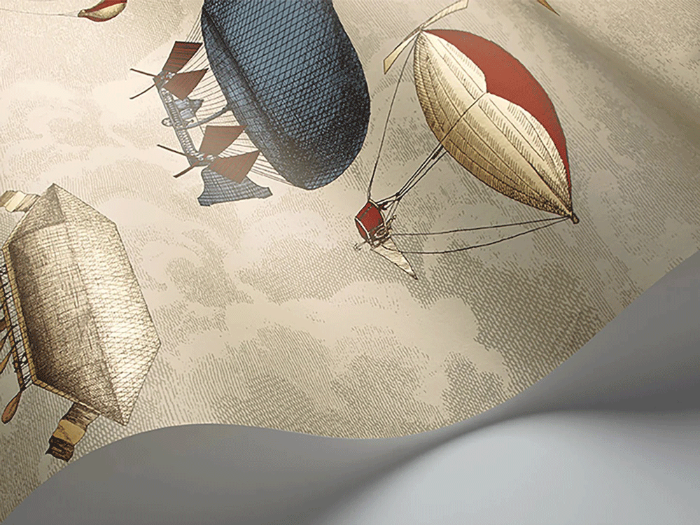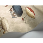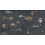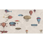Vliesbehang met oude luchtvoertuigen en een grijs-wit gestreeptje lucht.