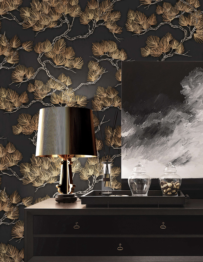 Het dessin WF121015 - pine tree black uit de collectie Best Sellers Collection Vol. 1 van Dutch is behang met een luxe uitstraling.