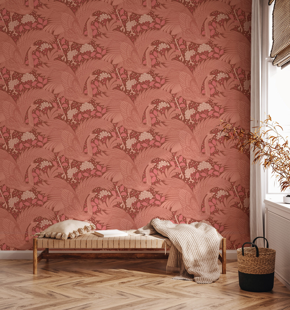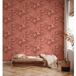 Het dessin Proud Birds - Fraise uit de collectie Days of Bloom van Dutch is behang met een luxe uitstraling. Het natuurdessin bestaat uit planten en dieren.