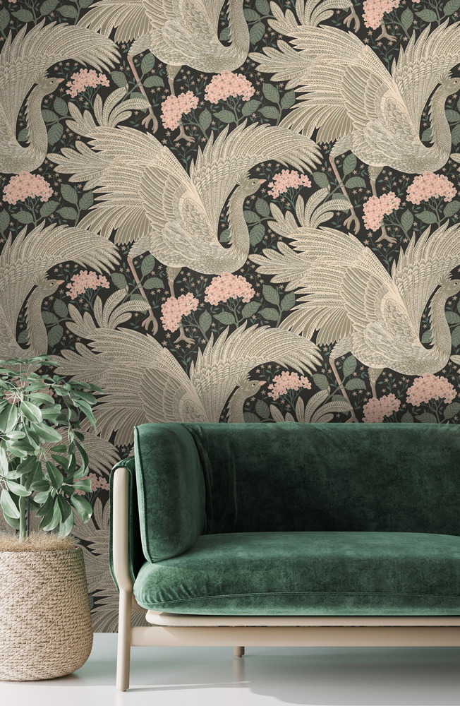 Het dessin Proud Birds - Sky uit de collectie Days of Bloom van Dutch is behang met een luxe uitstraling. Het natuurdessin bestaat uit planten en dieren.
