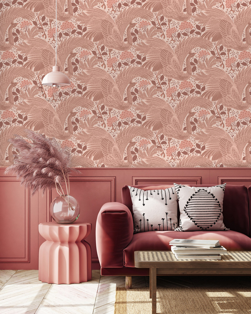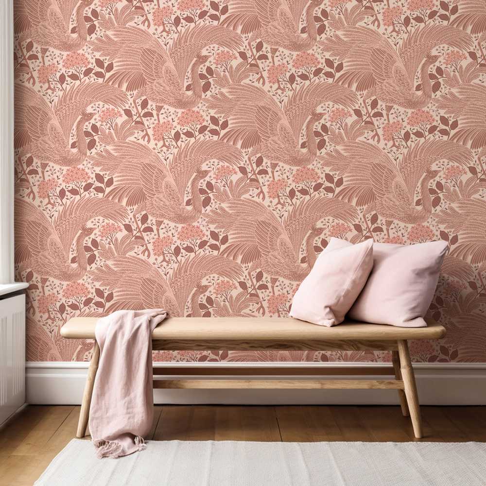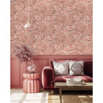 Het dessin Proud Birds - Terra uit de collectie Days of Bloom van Dutch is behang met een luxe uitstraling. Het natuurdessin bestaat uit planten en dieren.