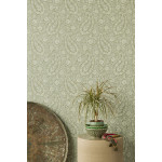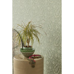 Het dessin 350655 uit de collectie Amber van Eijffinger is behang met een wit bloemenpatroon op een groene achtergrond.