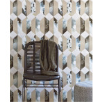Vliesbehang met een geometrisch patroon in het zilver, wit en blauw.