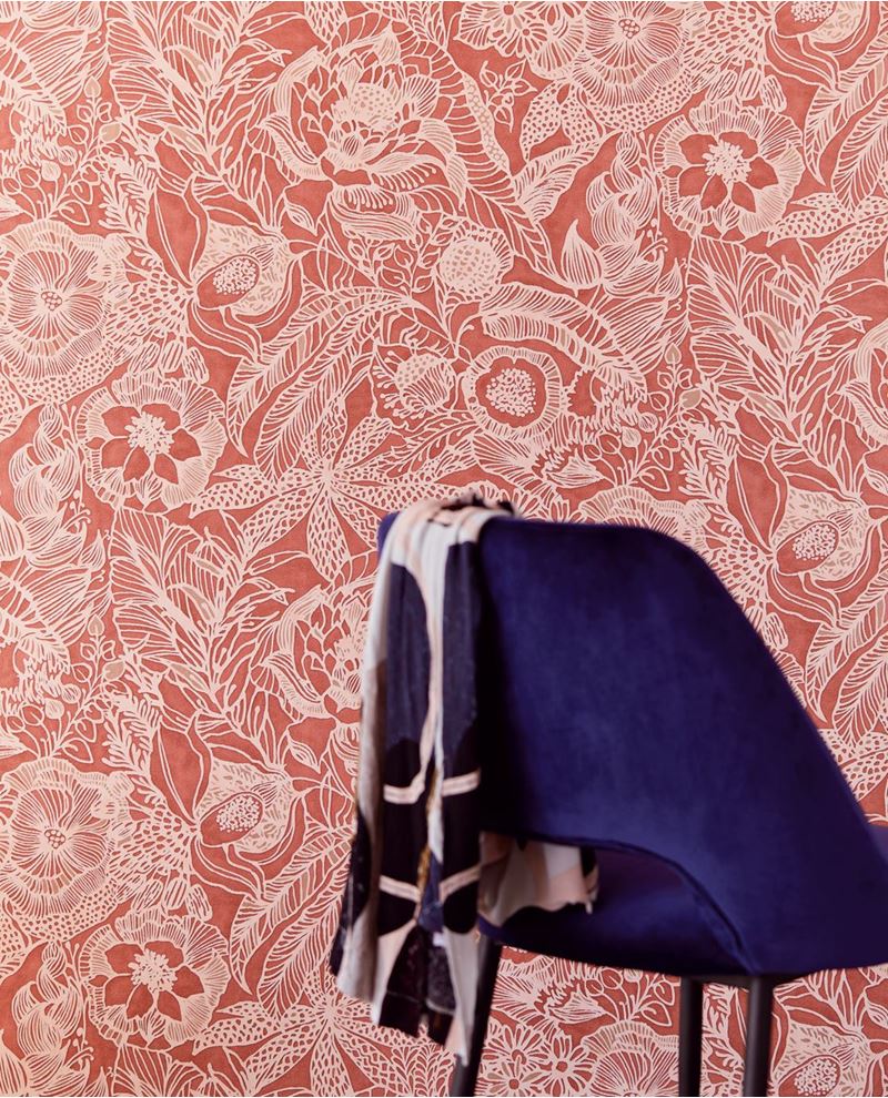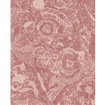 Rood vliesbehang met roze bloemen.