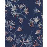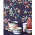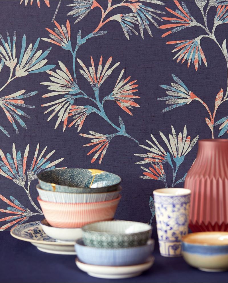 Donkerblauw vliesbehang met roze en blauwe bloemen.