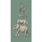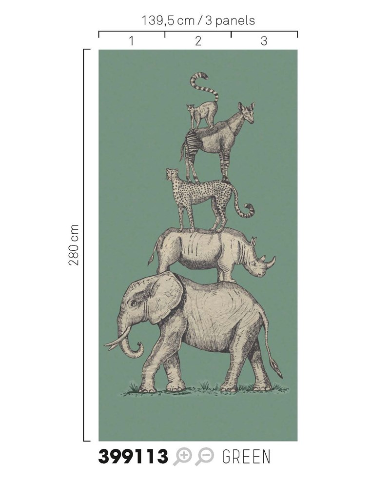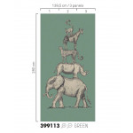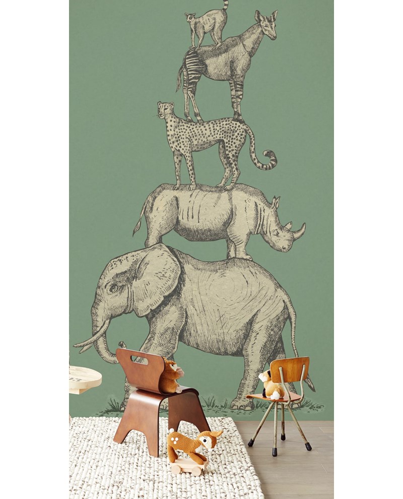 Mosgroen vliesbehang met jungle dieren die op elkaar staan. Dit behang komt uit de collectie Mini Me van Eijffinger.