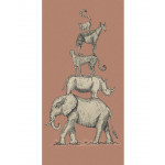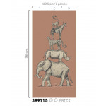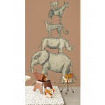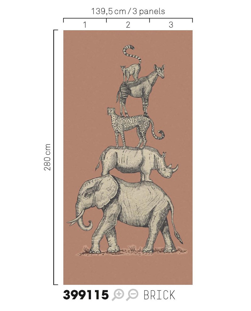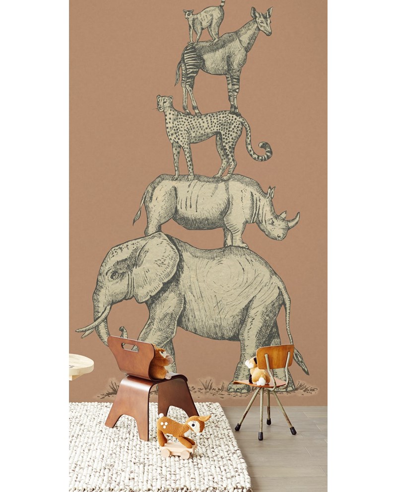 Steenrood vliesbehang met grijze jungledieren die op elkaar staan.