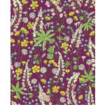 Vliesbehang in een bordeaux rode kleur. Het behang bevat verschillende soorten bloemetjes in de kleuren groen, blauw, roze, geel en wit. Ideaal behang voor een leuke kinderkamer.