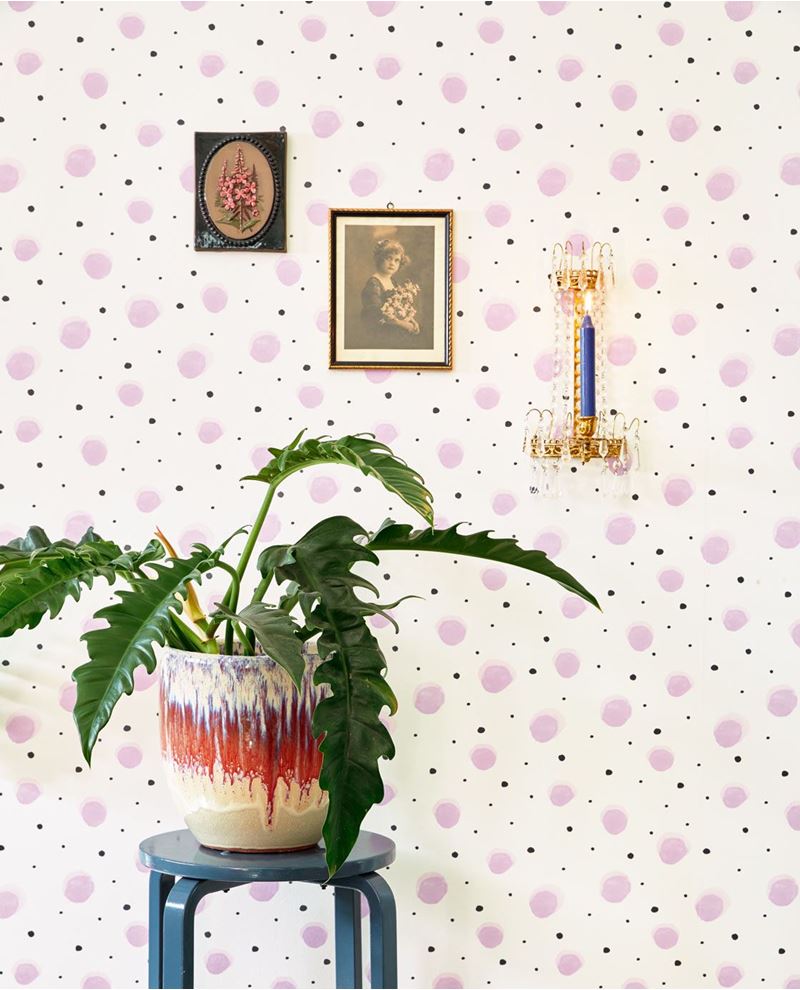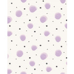 Wit vliesbehang met grote paarse stippen en kleinere zwarte stipjes. Leuk voor op een meisjeskamer.