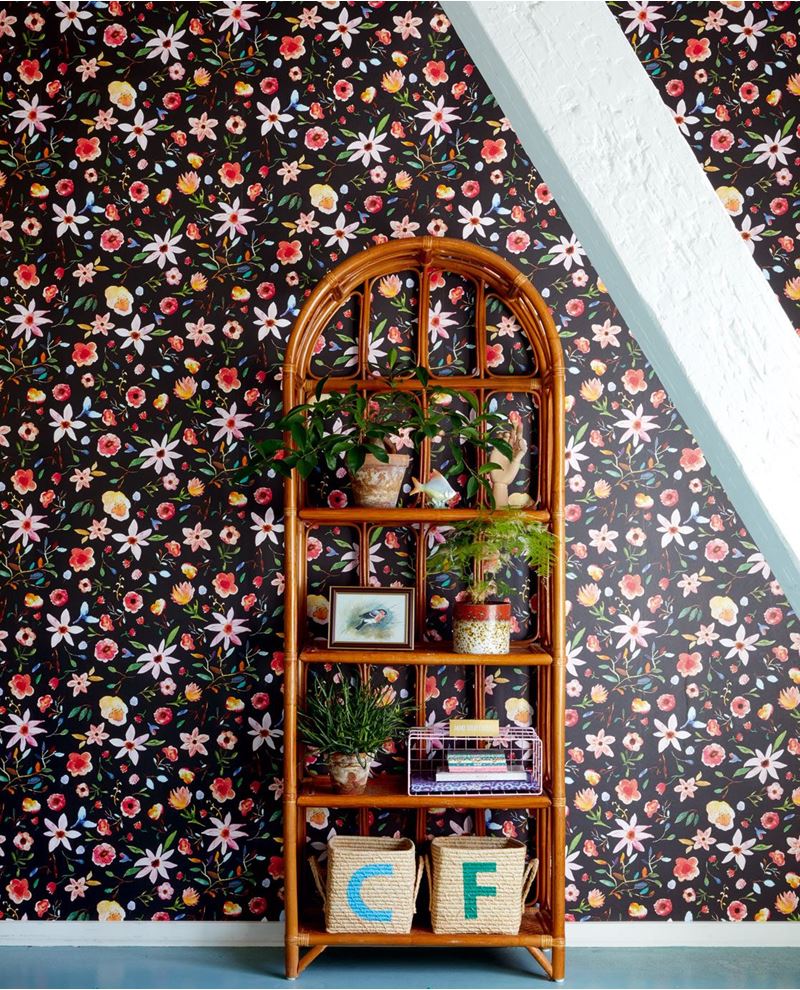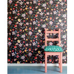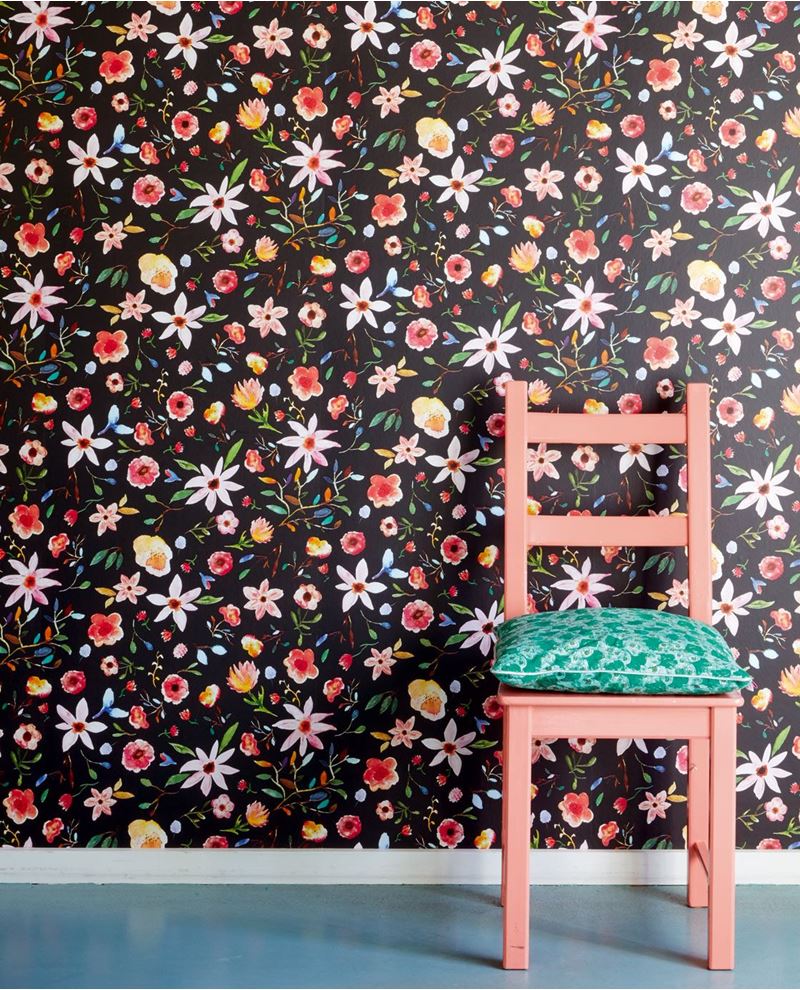 Grijs vliesbehang met vele gekleurde bloemen. De bloemen bestaan uit de kleuren roze, blauw, groen, rood en oranje.