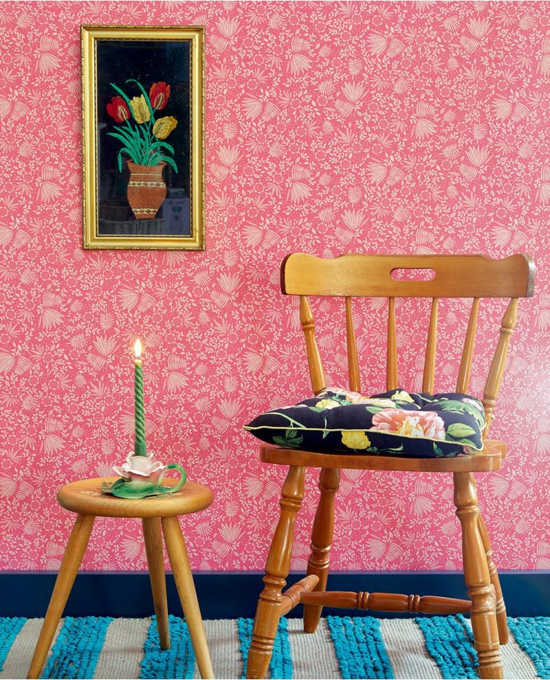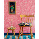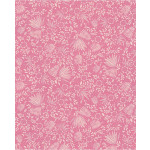 Roze vliesbehang met witte bloemen en planten. Ideaal behang voor in de kinderkamer.
