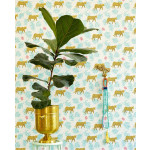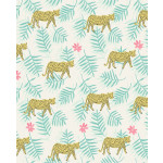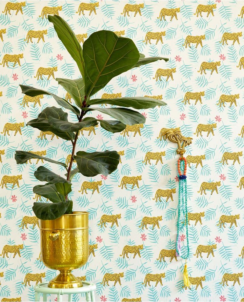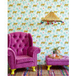 Wit vliesbehang met een print van gele panters en groene palmtakken. Ook staan er roze bloemetjes op het behang. Superleuk voor kinderkamers.