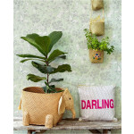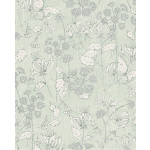 Lichtgroen vliesbehang met witte bloemen met blauwe details.