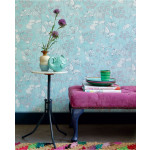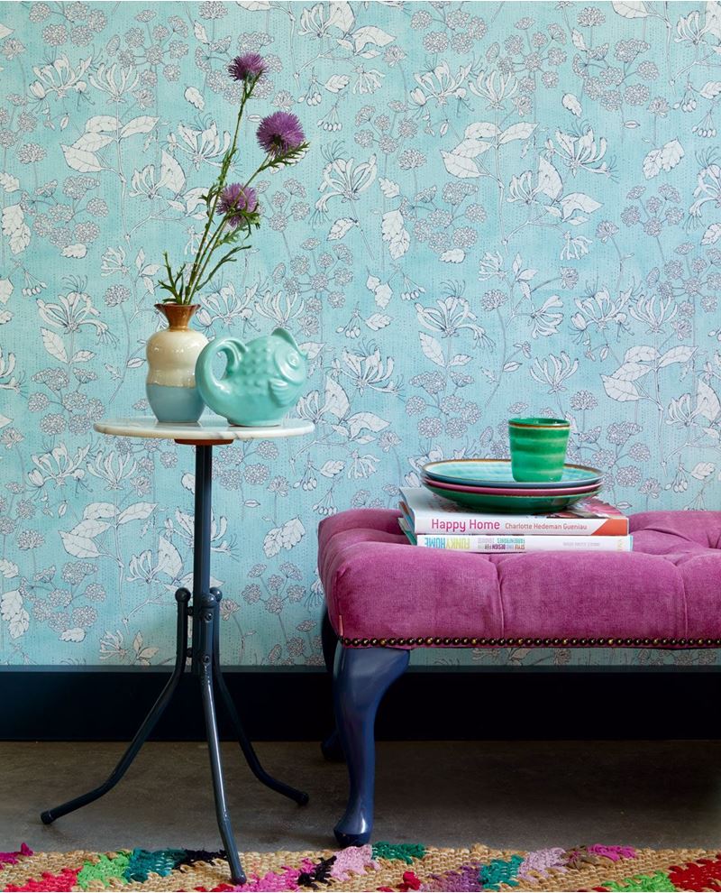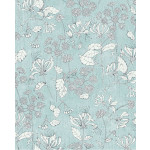 Lichtblauw vliesbehang met witte bloemen met donkerblauwe details.