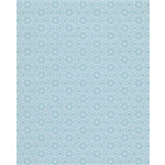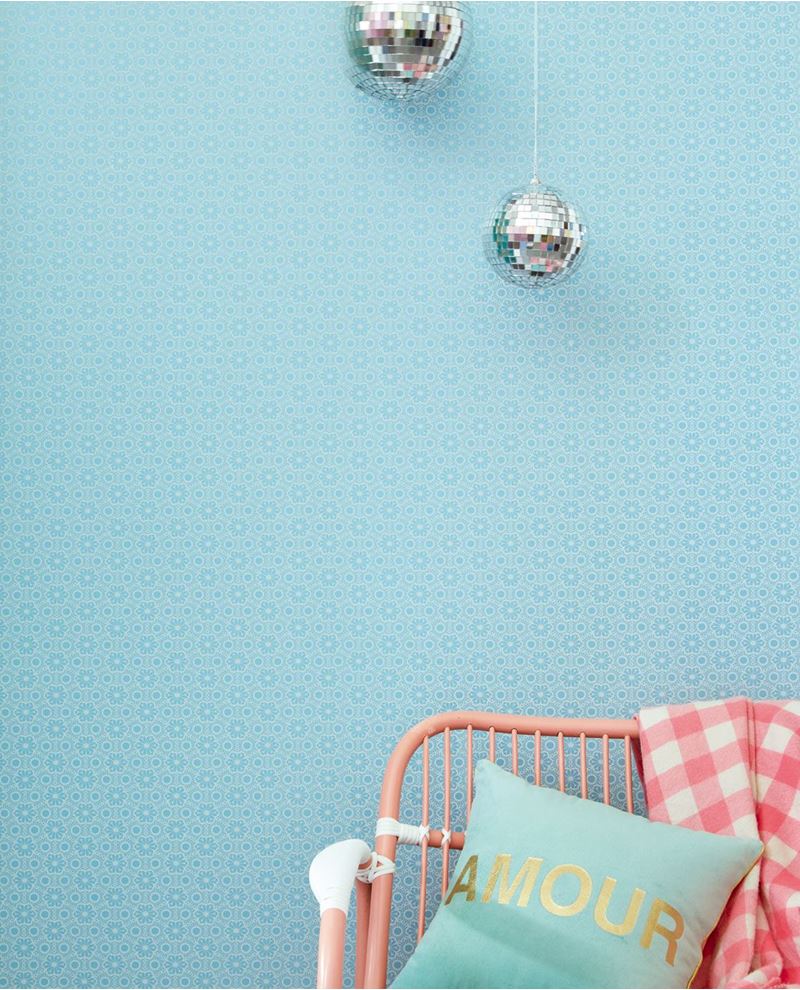 Lichtblauw vliesbehang met een wit bloemenpatroon.