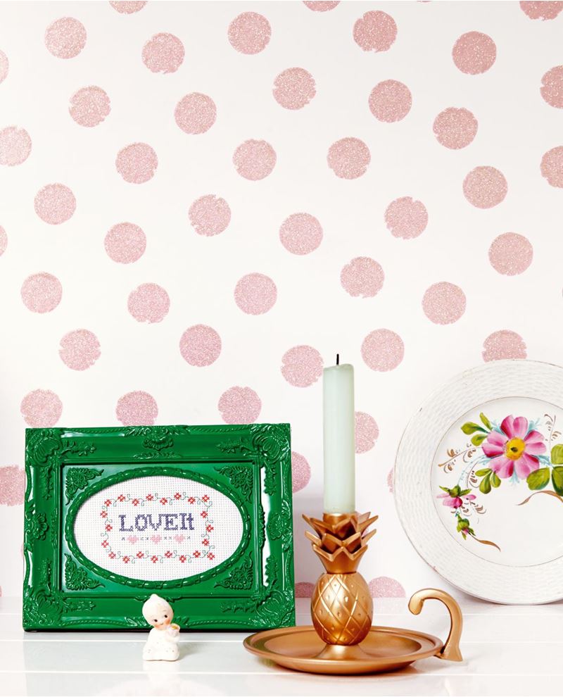 Wit vliesbehang met roze glitter stippen. Het perfecte behang voor een leuke meisjeskamer.