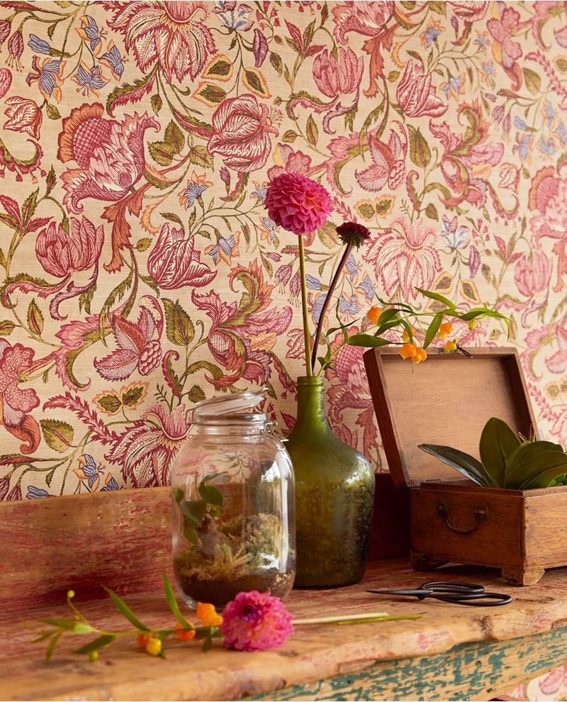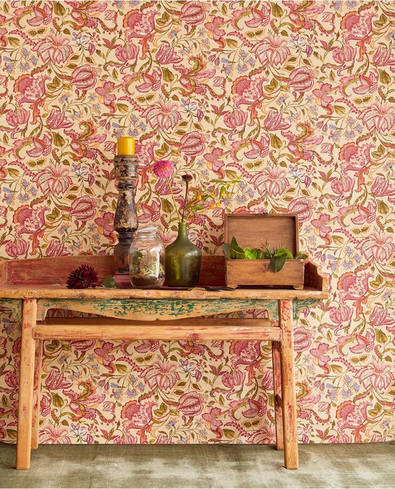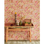 Lichtbruin vliesbehang met een subtiele glanslaag. Deze rustige achtergrond wordt gecombineerd met een sierlijk bloemenpatroon in verschillende vrolijke kleuren.