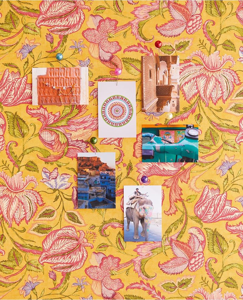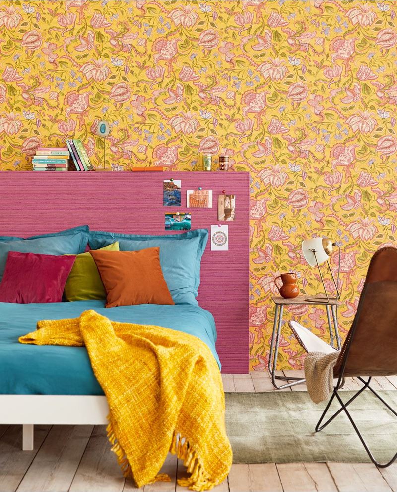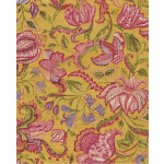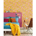 Goudkleurig behang met een sierlijk bloemenpatroon in de kleuren paars, groen en verschillende rozentinten. Het vrolijke, kleurrijke behang geeft een unieke sfeer aan elke kamer, maar is vooral geschikt om een slaapkamer een nieuwe look te geven.