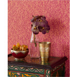 Roze behang met een glimmend, goudkleurig, vlekkerig patroon. Het behang heeft een sterke uitstalling door de combinatie van de felle kleur met de glimmende details. Perfect om een slaap- of woonkamer een nieuw, eigentijds uiterlijk te geven.