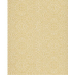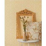 Wit behang met een glimmend goudkleurig patroon. Het patroon bestaat uit een combinatie van cirkels en bloemen en samen met de kleur maakt het een vrolijk geheel.