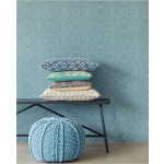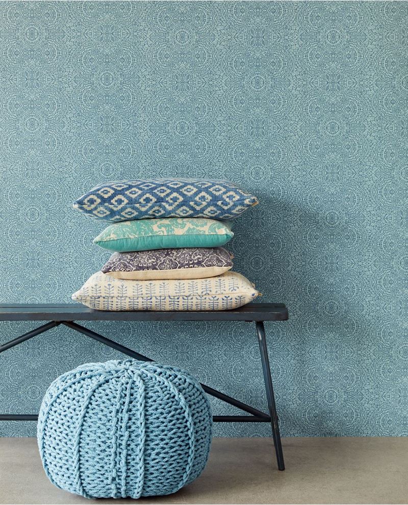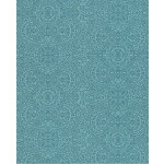 Lichtblauw behang met een sierlijk patroon bestaande uit verschillende plantenmotieven in cirkels opgebouwd. Dit behang doet oosters aan.
