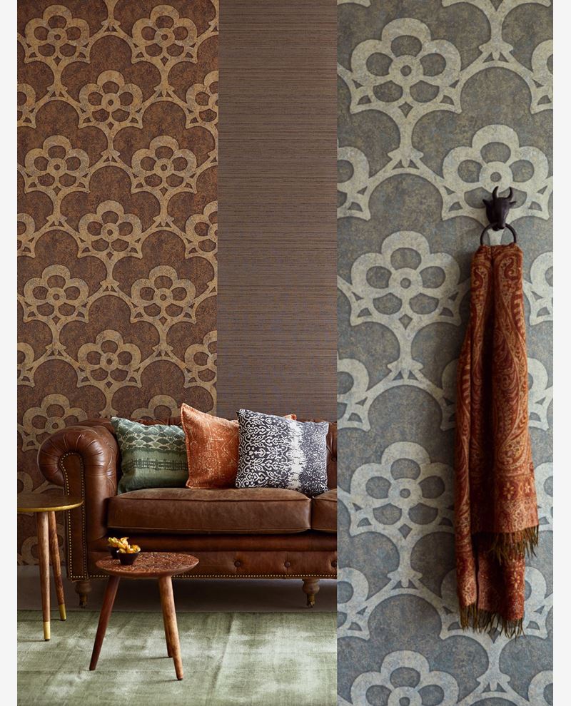 Wanposter in verschillende aardetinten met voornamelijk grijs- en bruin met een sierlijk patroon, geinspireerd op klassieke arabische kunst. Over het geheel ligt een subtiele glanslaag.