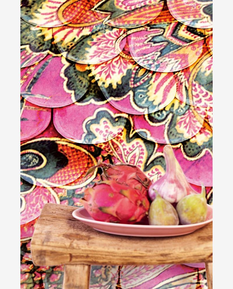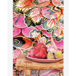 Felroze wandposter met een sierlijk bloemenpatroon in verschillende felle kleuren. Het opvallende geheel van de vele kleurrijke elementen waaruit deze wandposter bestaat vormt een innemend geheel waarmee een kamer in één keer omgetoverd kan worden tot een totaal andere plek.