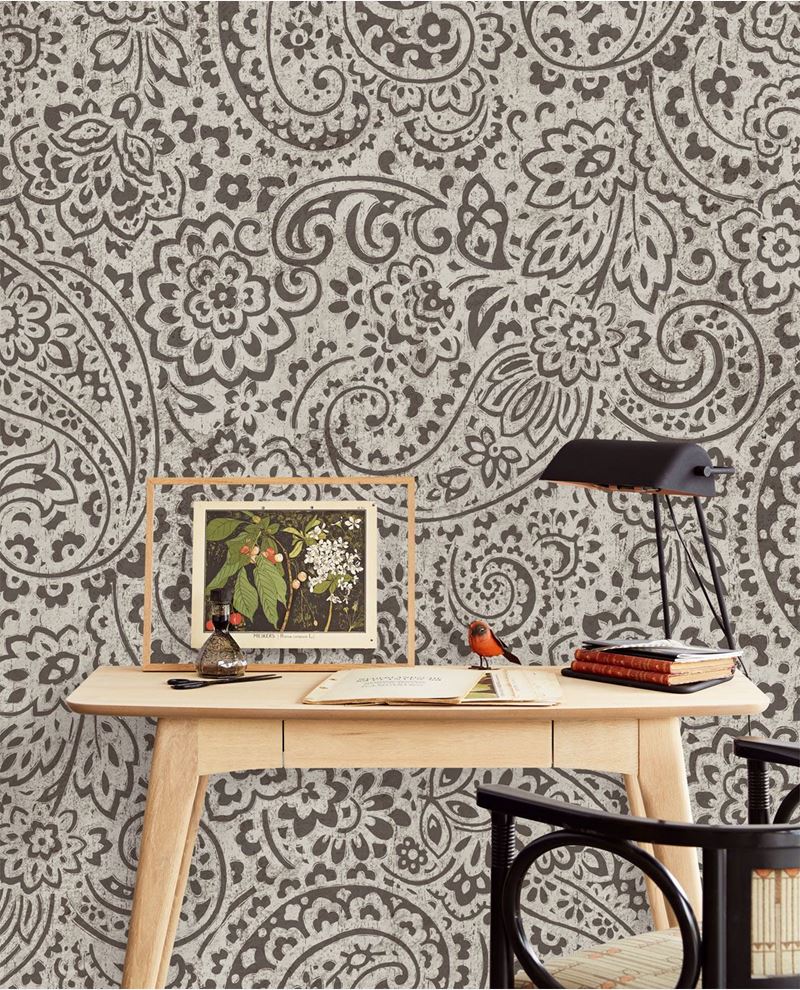Wandposter met een sierlijk plantenmotief in de kleuren lichtbruin en donkergrijs. Het design geeft het geheel een klassieke uitstalling, maar ook in een modernere omgeving houd dit behang stand door de contrasterende kleurcombinatie.