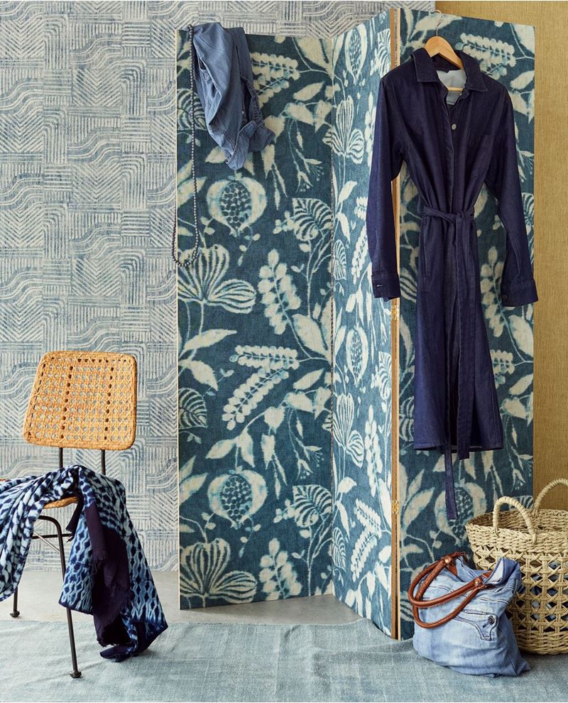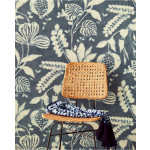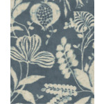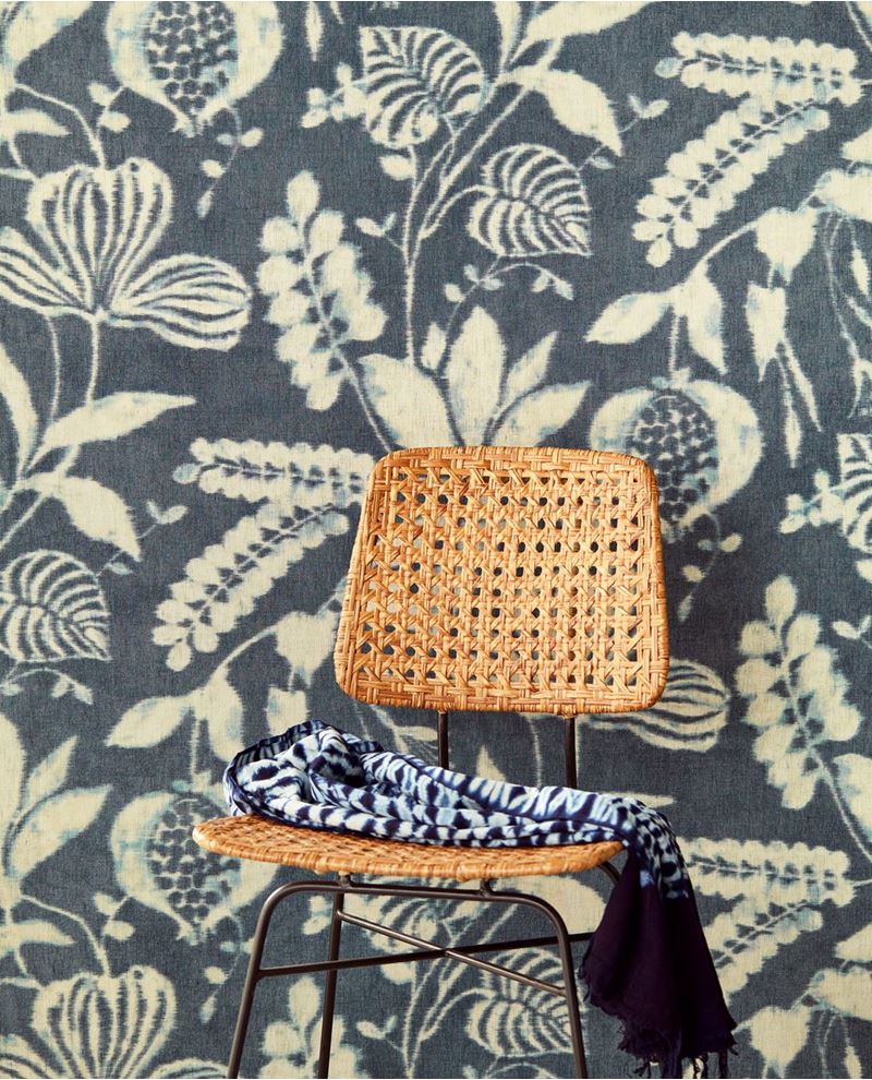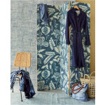 Donkerblauw vliesbehang met een linnenstructuur en beige bloemen en bladeren.