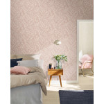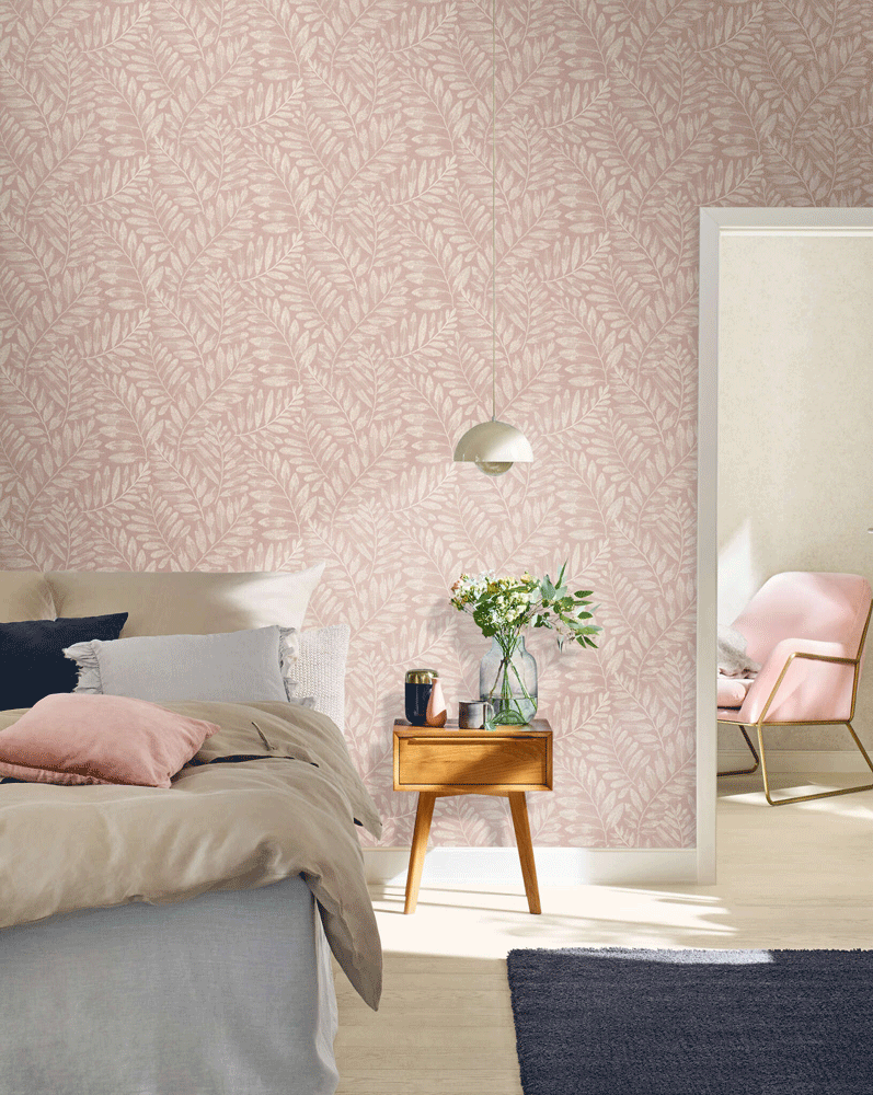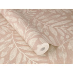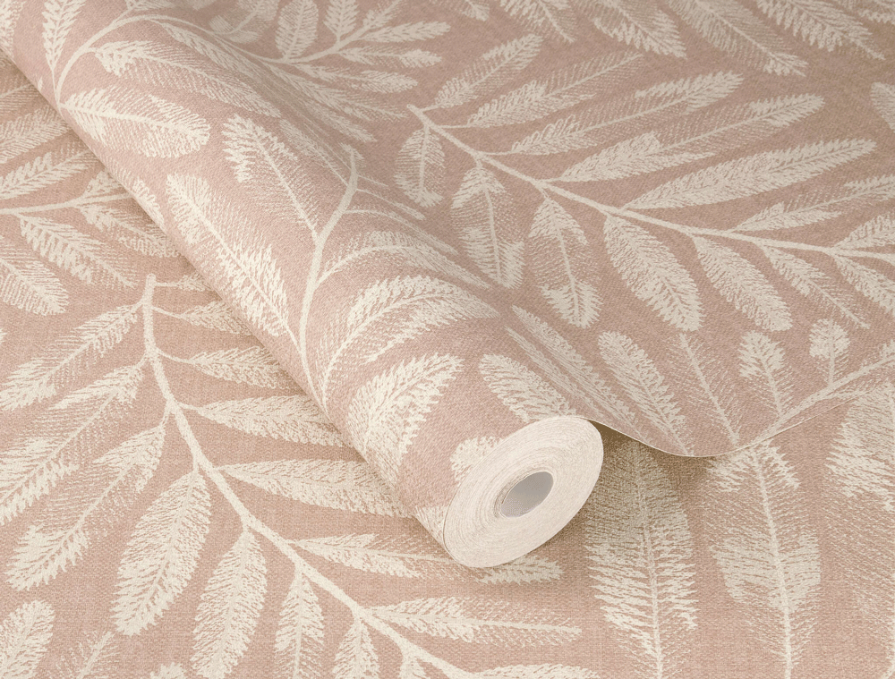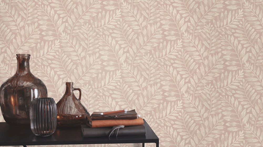 Een delicaat bladpatroon in een elegante crèmekleur ontvouwt zich op een zachte roze achtergrond en creëert een harmonieuze, natuurlijke sfeer. De fijne structuur van de bladeren is rijk aan details en filigrain, waardoor een nobel en toch gezellig karakter ontstaat. Hoogwaardig vliesmateriaal zorgt voor een eenvoudige toepassing en een duurzaam oppervlak.