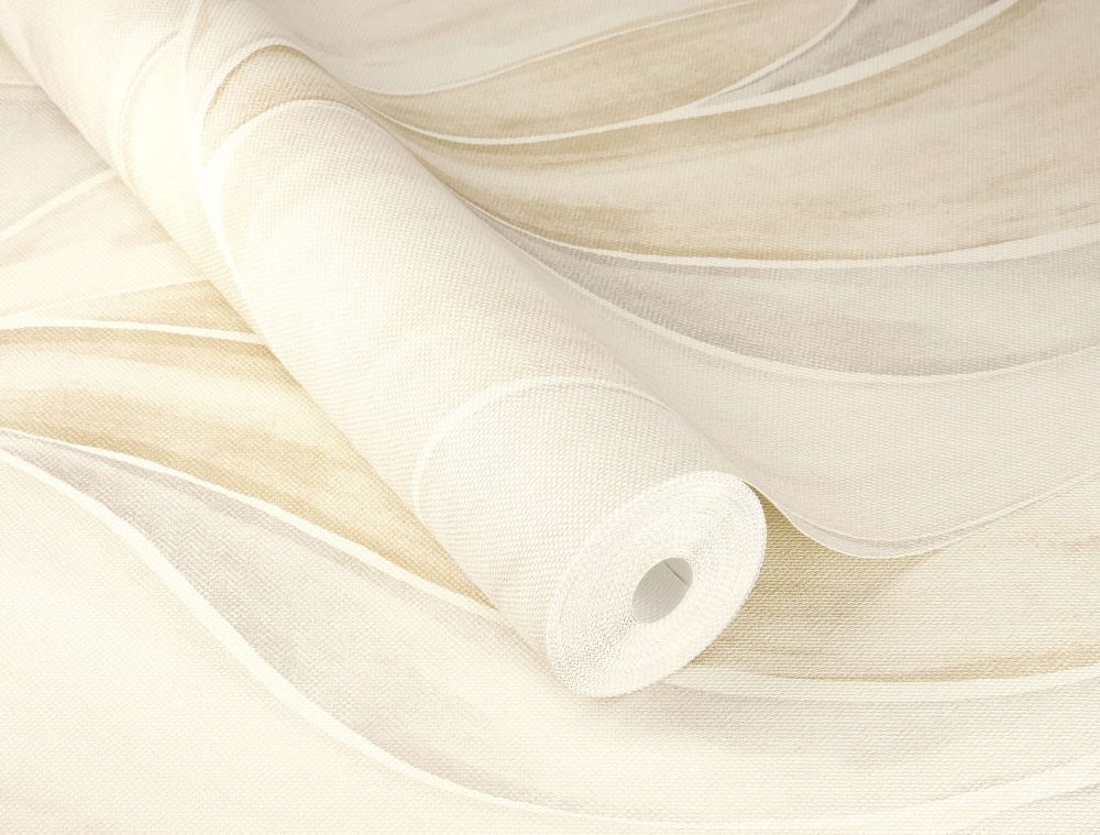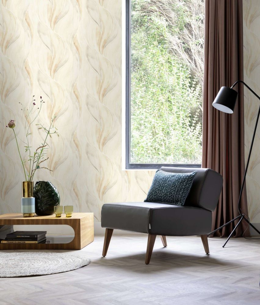 Dit behang heeft een patroon van grote, gebogen bladeren in delicate crème-, beige- en lichtgrijstinten. Het kleurenpalet is zeer licht en subtiel, met een zacht aquareleffect dat de bladeren een zachte, bijna vloeiende uitstraling geeft. De bladeren worden gescheiden door fijne witte lijnen, wat het ontwerp een duidelijke structuur en elegantie verleent. Dit patroon heeft een bijzonder lichte en luchtige uitstraling, ideaal voor ruimtes die een heldere en vriendelijke sfeer moeten behouden.