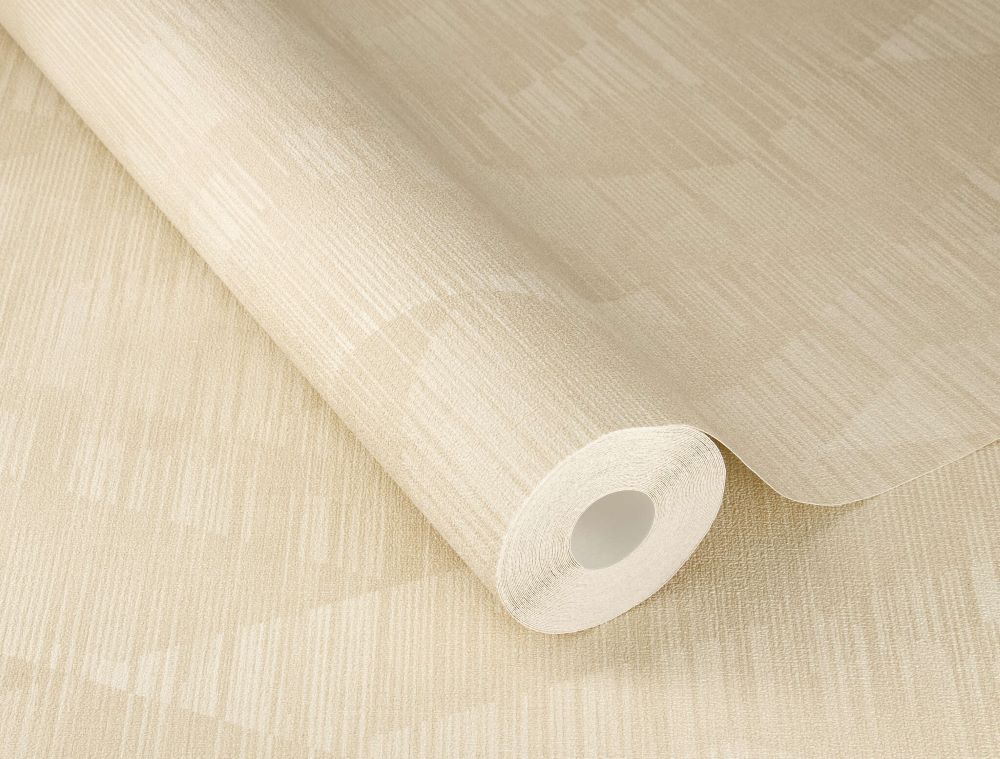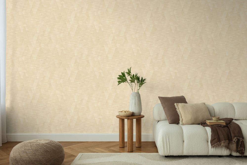 Dit behang heeft een subtiel geometrisch patroon van overlappende ruitvormen. De textuur ontstaat door fijne horizontale lijnen, die het ontwerp een subtiele diepte geven. Het kleurenpalet wordt gedomineerd door een warme beigetint, wat de ruimte een vriendelijke en lichte uitstraling geeft. Het patroon heeft een moderne maar tijdloze look, waardoor het behang veelzijdig toepasbaar is in de woonkamer, slaapkamer of hal. De zachte textuur en het ton-sur-ton-effect zorgen voor een rustige en harmonieuze sfeer.