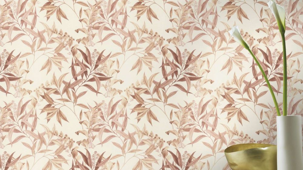 Dit behang heeft een delicaat bloemenpatroon met elegante bladeren en klokvormige bloemen. Het ontwerp is uitgevoerd in zachte beige- en roze tinten, wat zorgt voor een warme en harmonieuze uitstraling. De fijn uitgewerkte plantenmotieven doen denken aan botanische illustraties en creëren een rustige, natuurlijke sfeer in de ruimte. De lichte achtergrond benadrukt de luchtigheid van het patroon en maakt dit behang ideaal voor woonkamers en slaapkamers die een zachte, stijlvolle uitstraling nodig hebben.