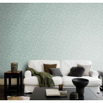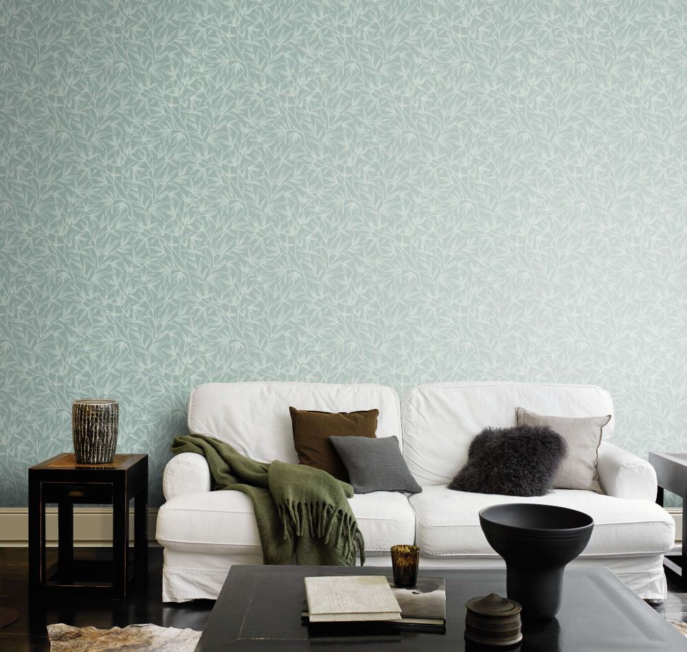 Het behang heeft een delicaat, rustgevend patroon van bamboetakken in een frisse, pastelblauwgroene kleur. De fijne witte lijnen benadrukken de filigrane bladeren en takken, wat het ontwerp een elegante en natuurlijke uitstraling geeft. Het zachte kleurenpalet op de kalmerende achtergrond creëert een vredige sfeer, perfect voor moderne, ontspannen ruimtes. Dit behang is ideaal voor slaapkamers, woonkamers of zelfs kantoren waar een harmonieuze en rustige omgeving gewenst is.