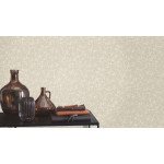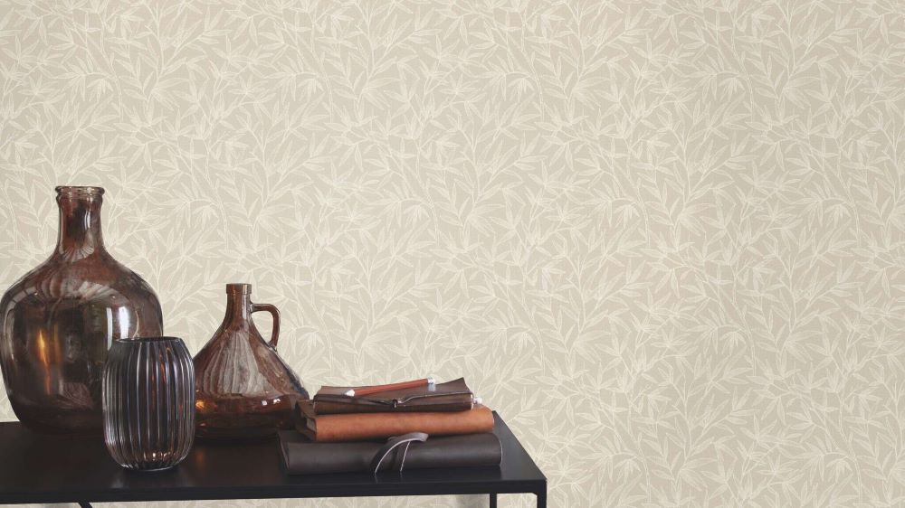 Het behang heeft een delicaat bamboeontwerp met filigrane witte takken die zich uitstrekken over een subtiele beige achtergrond. De fijne lijnen en de harmonieuze kleurcombinatie van beige en wit stralen een rustige en elegante sfeer uit. Dit ontwerp brengt natuurlijke elementen in de ruimte en creëert een ontspannen, uitnodigende ambiance. Ideaal voor moderne woonruimtes, kantoren of ontspanningsruimtes; dit patroon sluit perfect aan bij diverse interieurstijlen en zorgt voor een subtiel maar stijlvol wandontwerp.